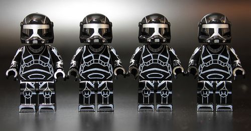 These Republic Commandos Omega Squad Custom Minifigures look very striking! The decal matches the silver on the printed Arealight helmets that these minifigures are wearing.